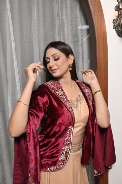 The flowing champagne gown drapes beautifully, creating a soft, graceful silhouette that flatters every body type. Paired with a rich wine-maroon velvet cape detailed with intricate embroidery, the look becomes instantly royal and statement-worthy. The cape adds depth, contrast, and sophistication while keeping the overall ensemble lightweight and comfortable.