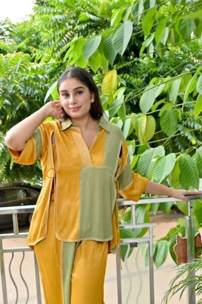 Add a modern twist to your ethnic wardrobe with this eye-catching Dual-Tone Yellow Green Panelled Co-Ord Set from Karpasa. Uniquely crafted, the set features a statement collared shirt and matching straight pants, featuring playful panels of mustard yellow and sage green for a color-blocked effect that’s both trendy and vibrant.