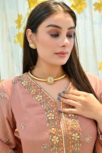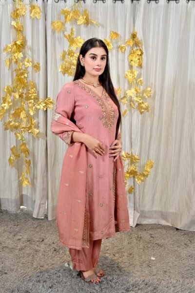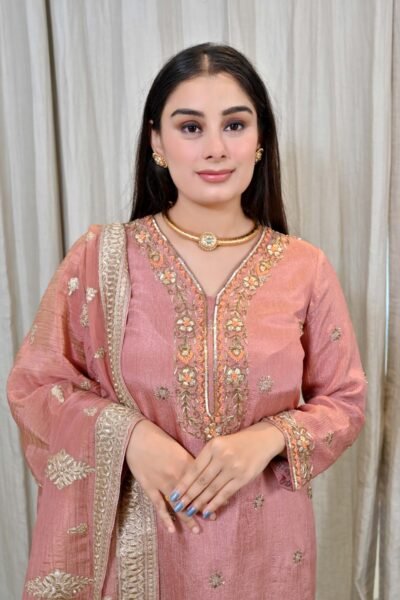 Step into a world of grace and charm with this stunning blush pink embroidered suit set from Karpasa. This ensemble effortlessly blends contemporary sophistication with timeless traditional artistry, making it a must-have for every modern woman’s festive wardrobe.