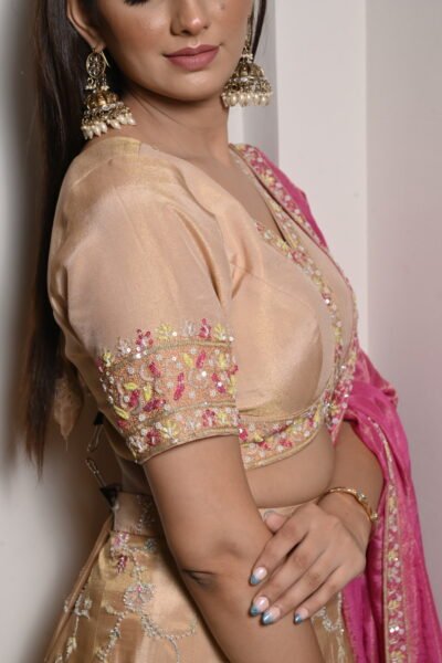 – Color: Peach Lehenga & Blouse with a Vibrant Pink Dupatta