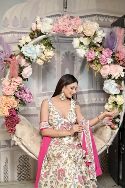 Step into elegance with our Floral Bloom Organza Anarkali Gown, an exquisite creation from Karpasa. Designed to make you feel graceful and confident, this outfit beautifully blends traditional Indian craftsmanship with a touch of modern charm.