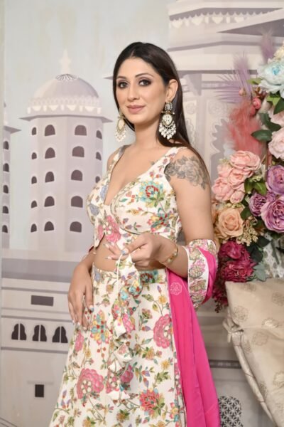 The gown features a soft ivory base adorned with vibrant floral motifs in shades of pink, green, and blue, giving it a fresh and feminine appeal. The deep neckline and structured silhouette create a flattering look, while the contrasting hot pink dupatta adds a pop of color, enhancing the entire ensemble.