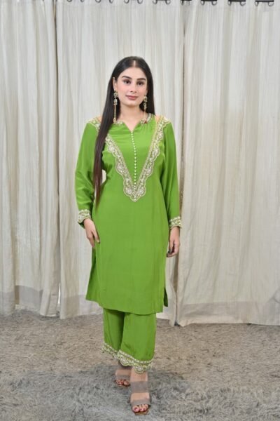 Whether you’re attending a family gathering, festive celebration, or an elegant evening event, this embroidered green suit will keep you looking effortlessly graceful and stylish. Pair it with statement earrings and heels to complete your look.