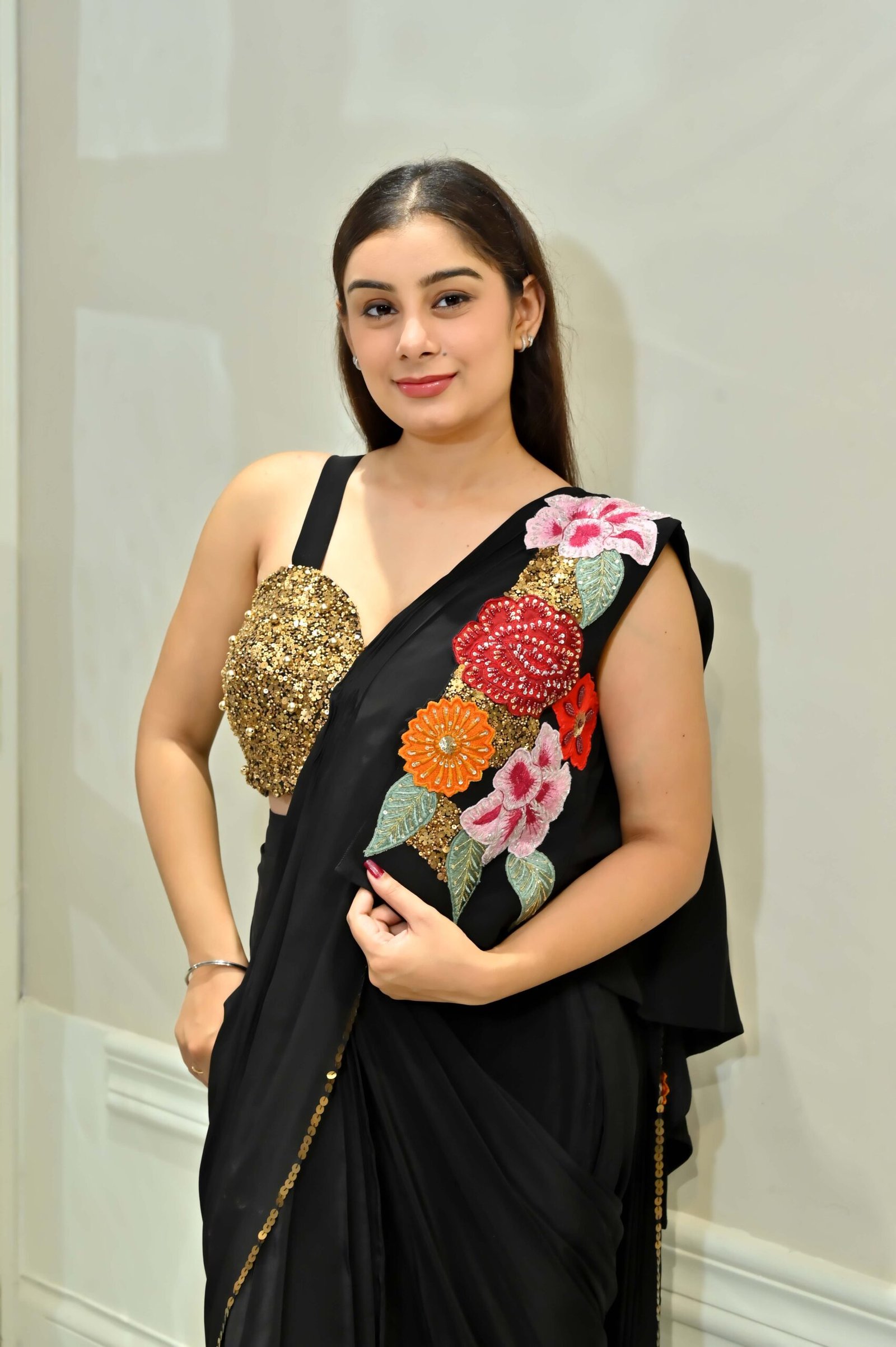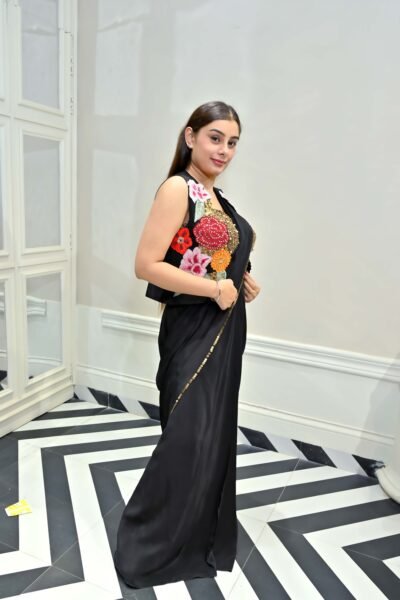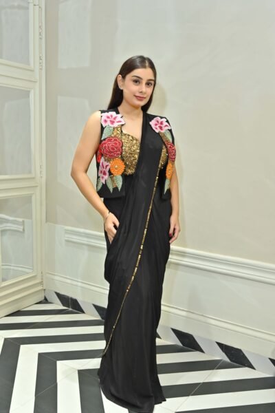 The ensemble is further amped up with a beautiful statement jacket, lavishly adorned with vibrant floral thread embroidery and sparkle details, allowing endless style versatility. Whether you wear it with or without the jacket, the result is striking, bold, and red-carpet ready. Perfect for wedding receptions, cocktail parties, sangeet nights, or glamorous evening affairs.