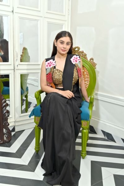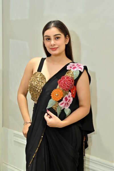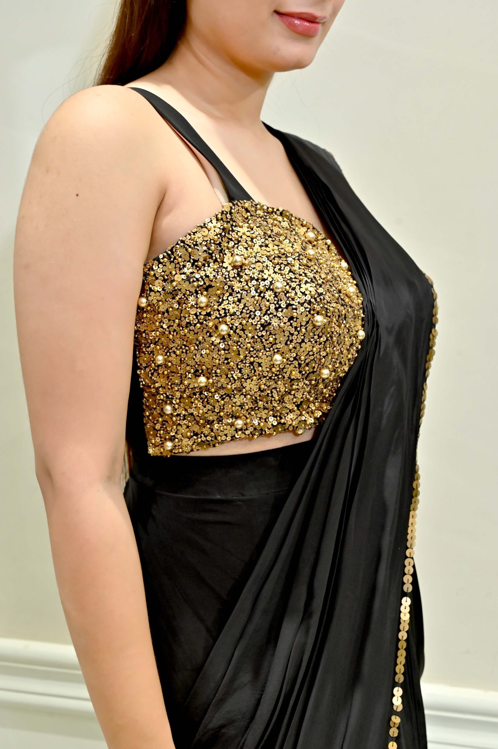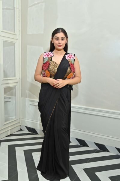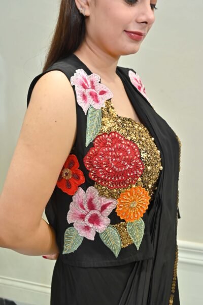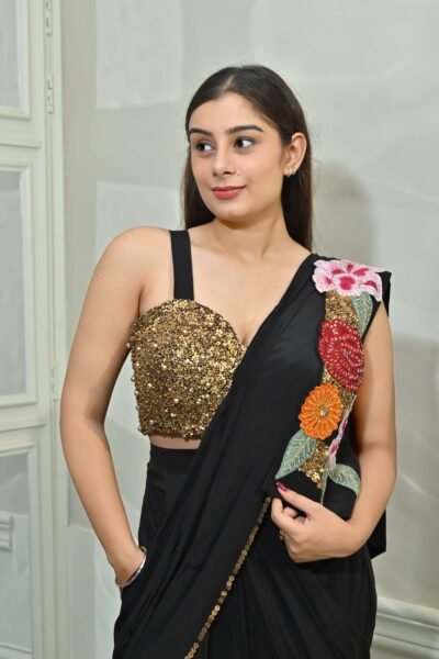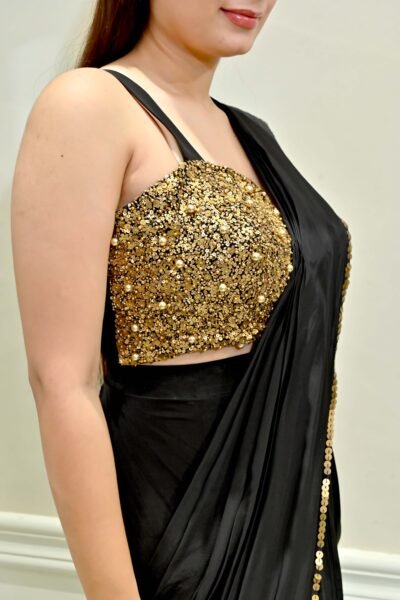 Turn heads at your next celebration in this dazzling Midnight Sparkle Embroidered Black Drape Saree Set from Karpasa. This designer showstopper features a liquid black ready-to-wear drape saree crafted in a soft, flowy fabric for effortless movement and comfort. The true magic lies in its intricately hand-embroidered gold sequin and bead work blouse—a glamorous piece that combines shimmer, pearls, and high-fashion allure.
