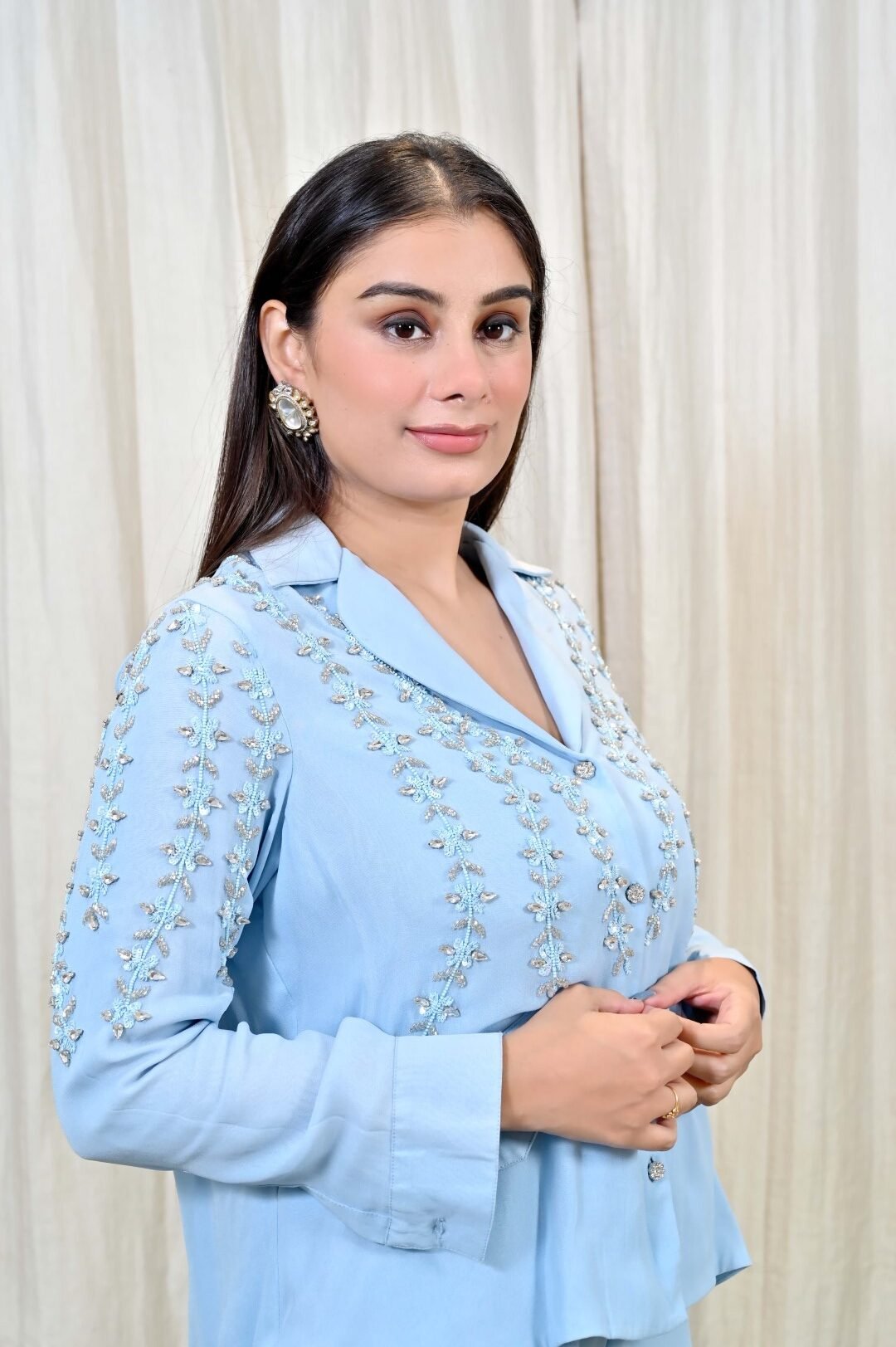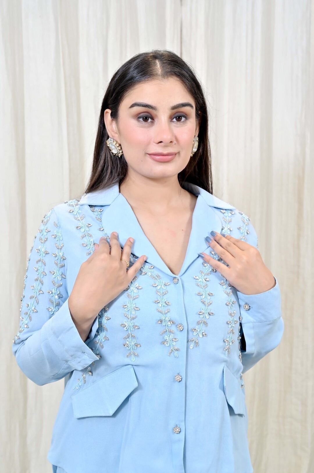 The highlight of the ensemble is its exquisite hand-embroidered detailing across the shirt and sleeves, shimmering with delicate thread and sequin work, adding understated sparkle to your look. Crafted from a soft, breathable crepe blend, this co-ord is as comfortable as it is striking — perfect for elegant brunches, intimate celebrations, festive evenings, or when you just want to feel flawlessly put together.