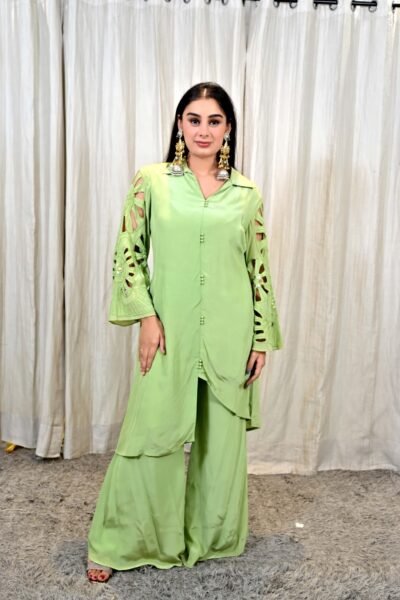 The set includes a collared kurta front-open with fabric buttons and flared palazzo pants, both crafted from an ultra-soft, flowy fabric that ensures comfort along with a beautiful drape. The highlight of this ensemble is its artistic floral cut-work and delicate threadwork, giving it a unique designer vibe that stands out in any crowd.