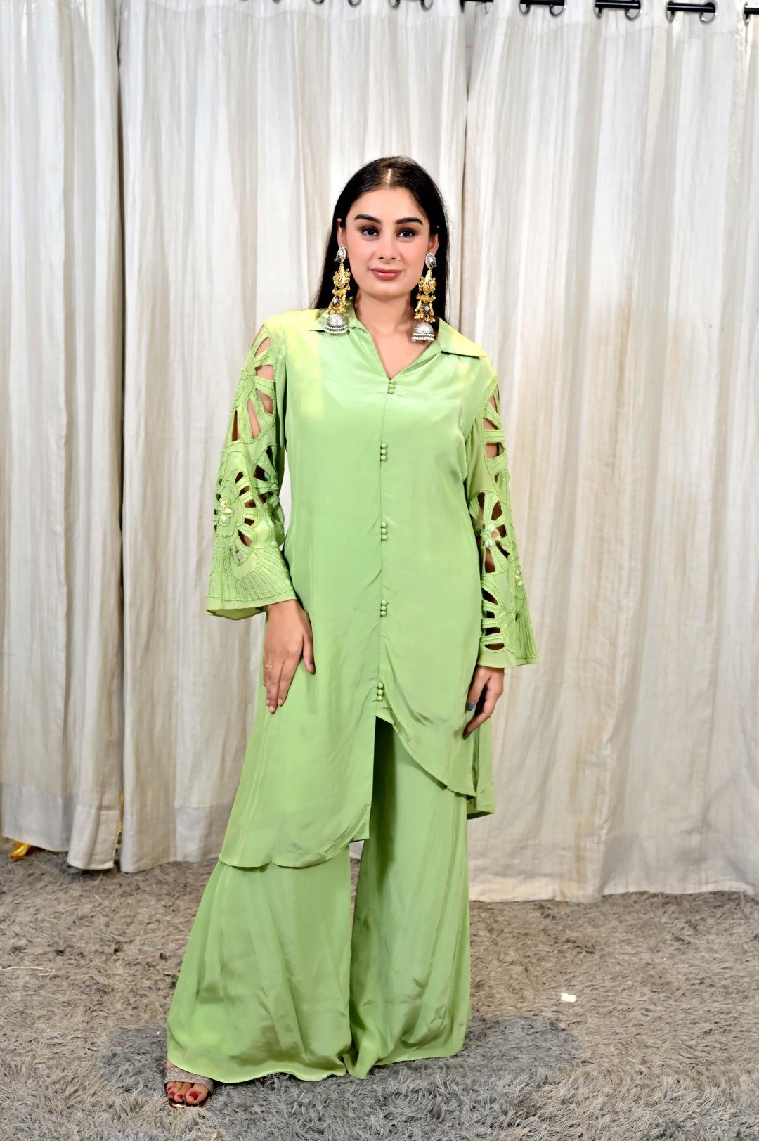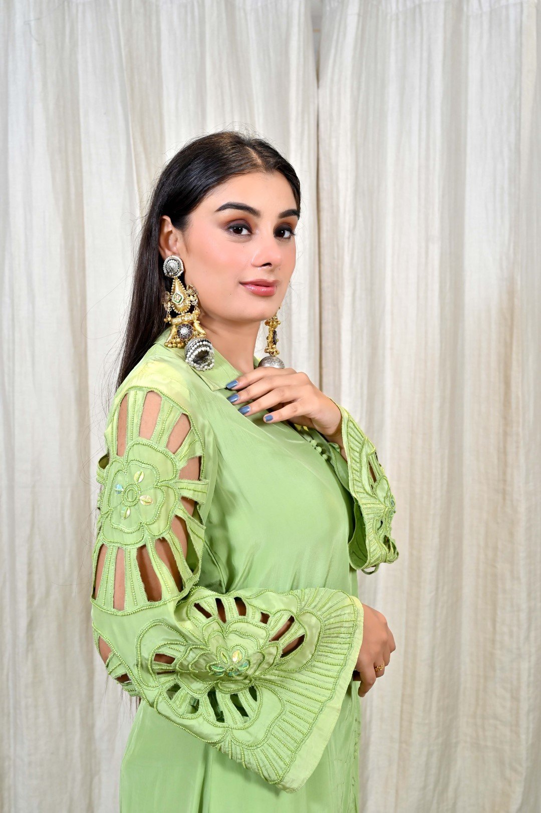Embrace effortless elegance with this stunning sage green embroidered cut-work co-ord set from Karpasa. This outfit fuses the freshness of modern silhouettes with the allure of traditional artistry, featuring intricate cut-work and embroidery on the statement sleeves that adds a touch of sophistication and charm.