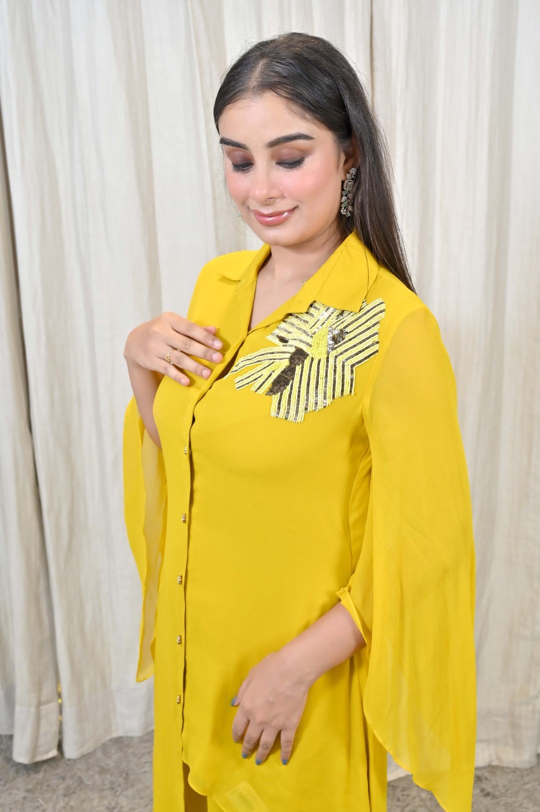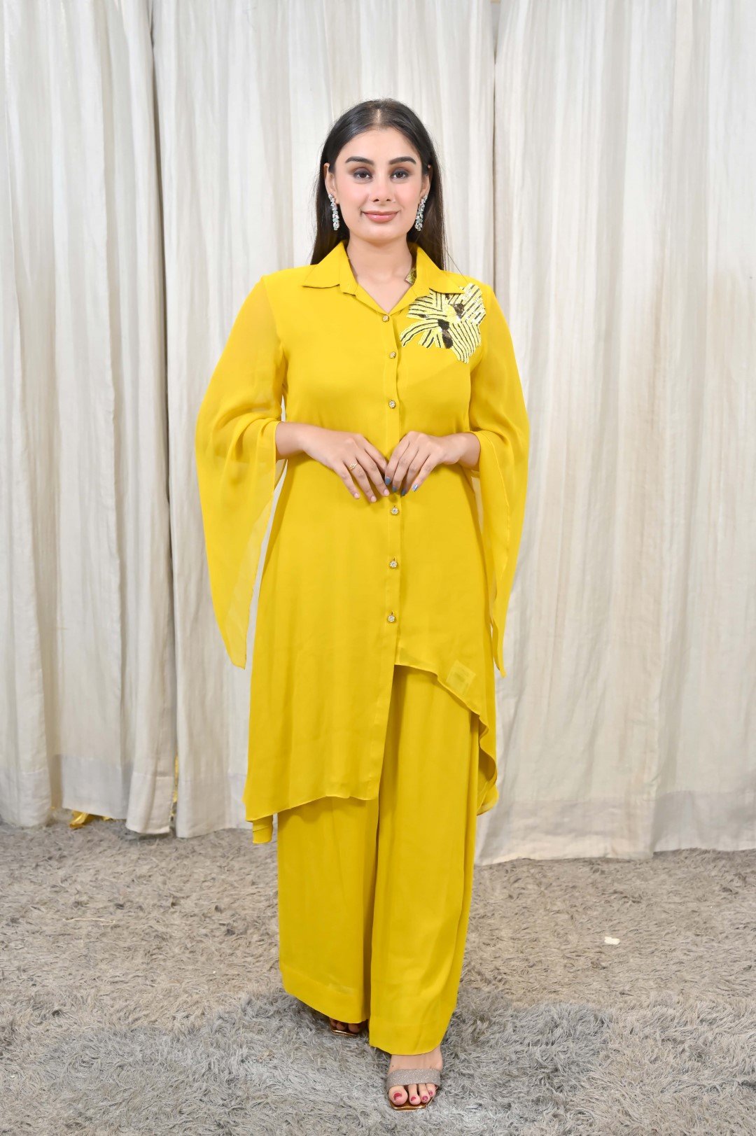 Step out and shine in this radiant Sunbeam Yellow Embroidered Co-Ord Set from Karpasa. Elegantly blending vibrant energy with contemporary structure, this ensemble brings together a trendy front-open kurta and flowing palazzo pants for a look that is both modern and captivating.