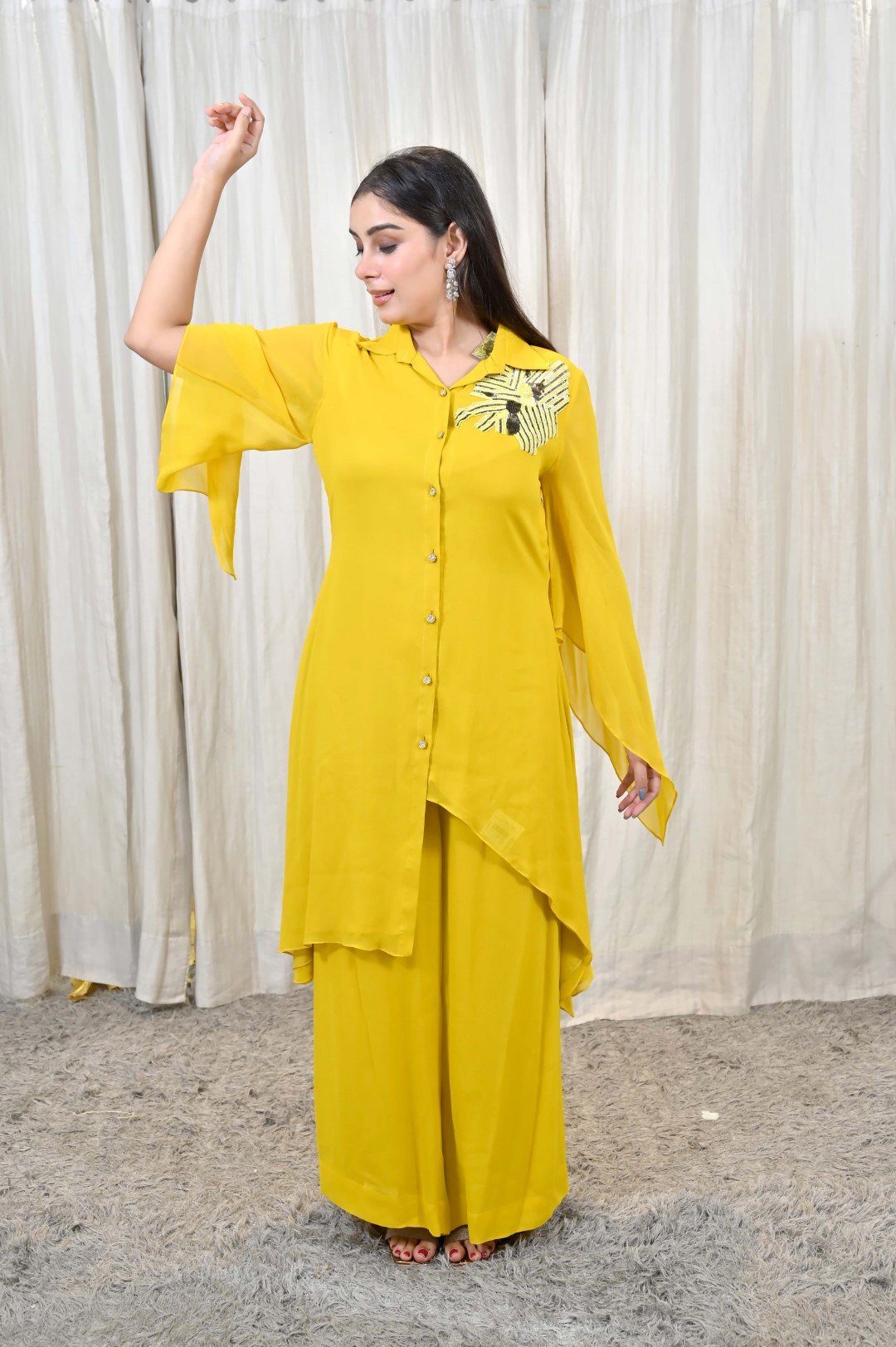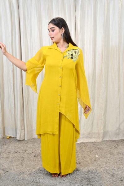 The highlight of this set is its asymmetrical hemline, statement flared sleeves, and a unique beaded and sequin floral motif on the shoulder, adding a chic touch of glamour. Crafted from premium, lightweight georgette, the outfit promises comfort, fluid movement, and a graceful drape, making it perfect for festive brunches, mehendi ceremonies, semi-formal gatherings, or fashionable day events.