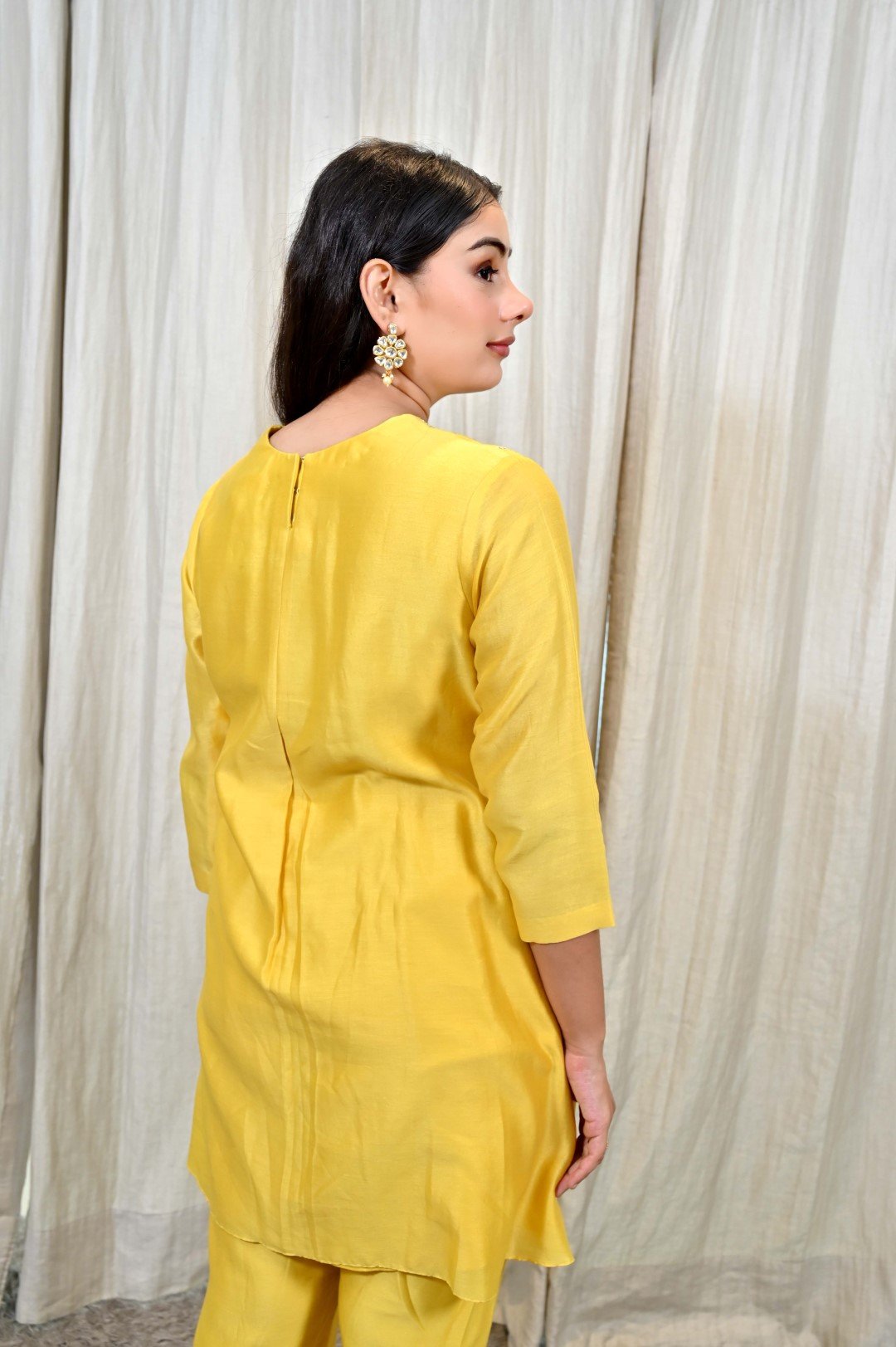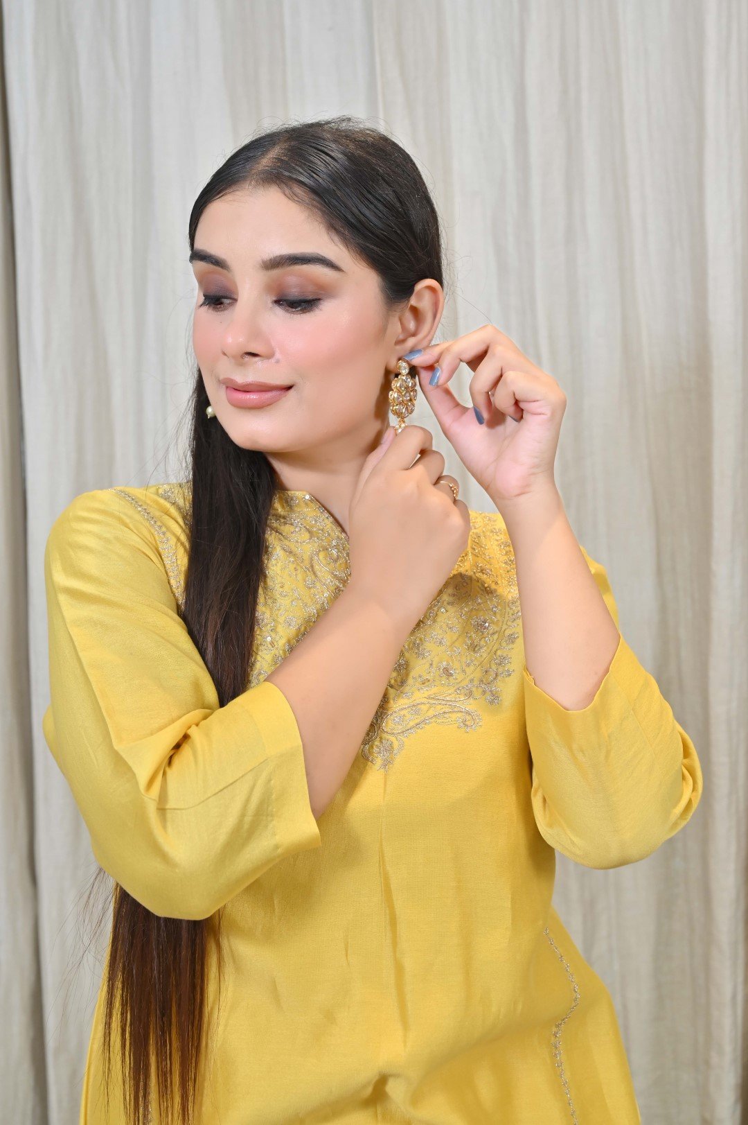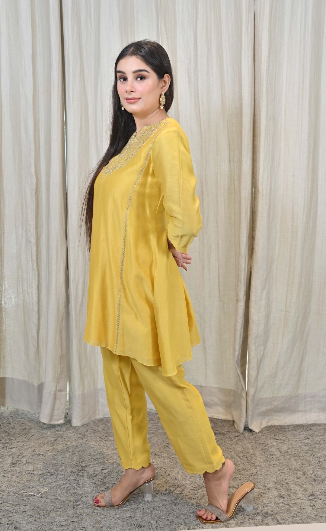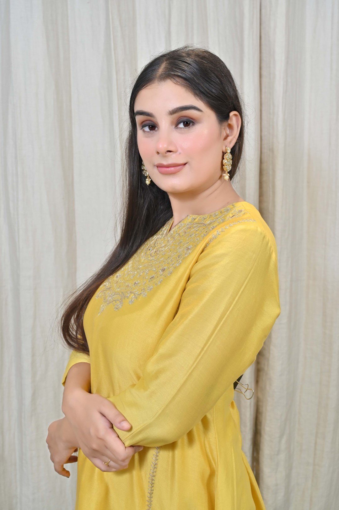 This stunning suit is crafted in a radiant yellow tone that exudes joy and positivity. The kurta features delicate embroidery around the neckline, adding a subtle sparkle that enhances its charm without being overwhelming.
