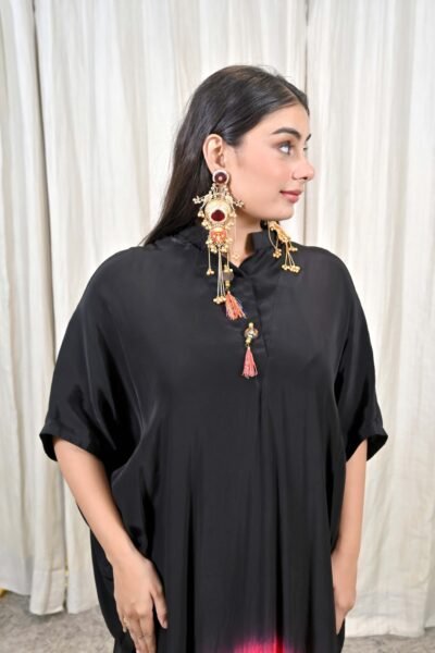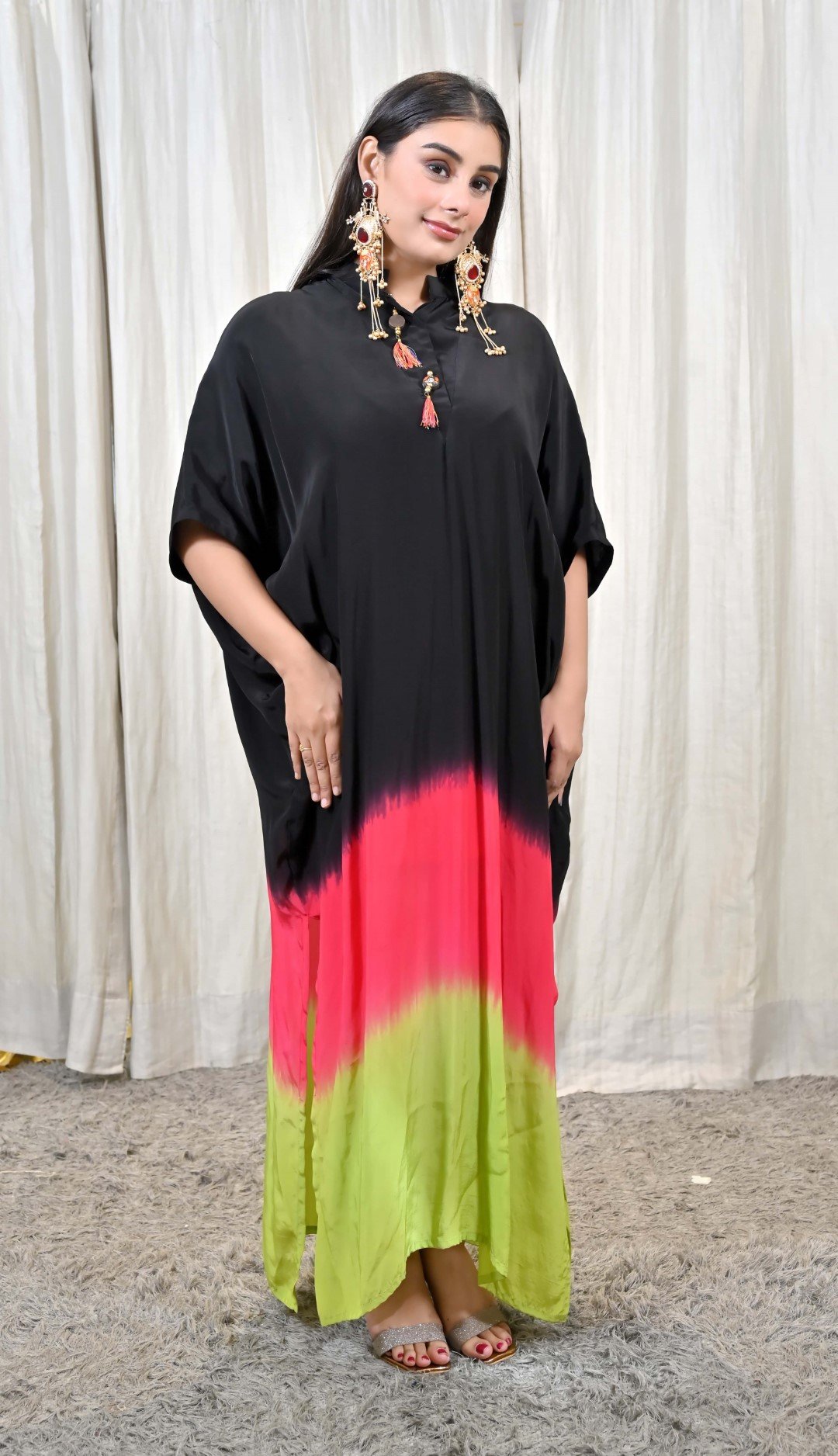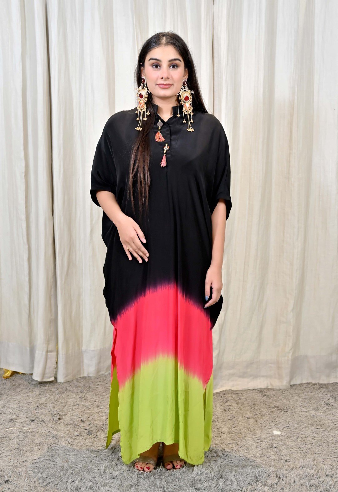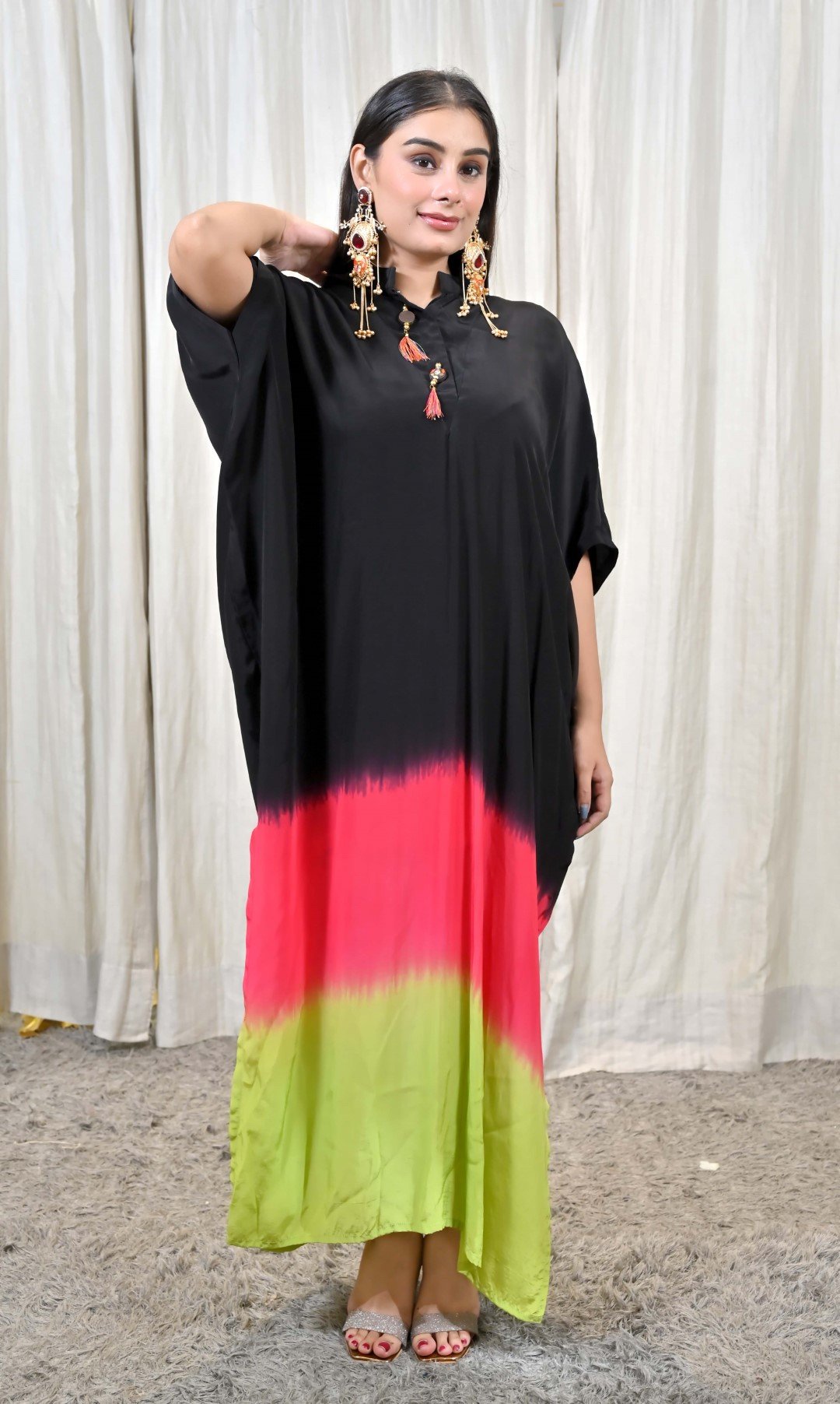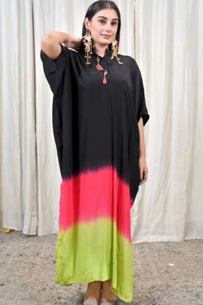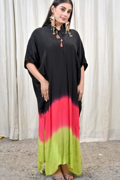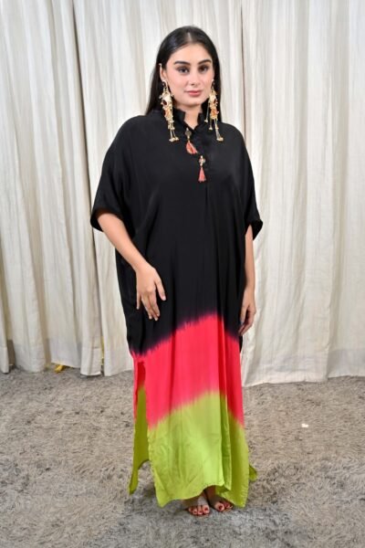 Step into a world of playful sophistication with this striking Tricolor Ombre Kaftan Gown Dress from Karpasa. Crafted in a free-flowing silhouette, the dress features an elegant blend of black, vibrant pink, and fresh lime green, creating an ombre effect that is modern, bold, and utterly unforgettable.