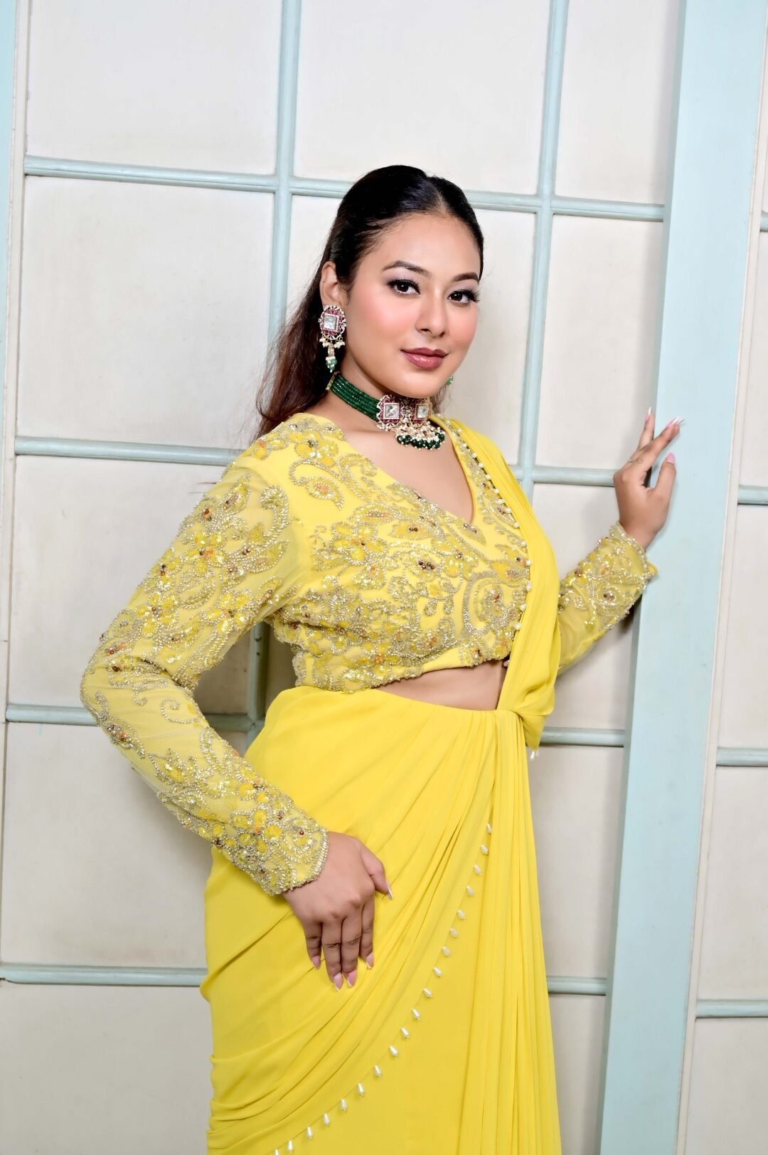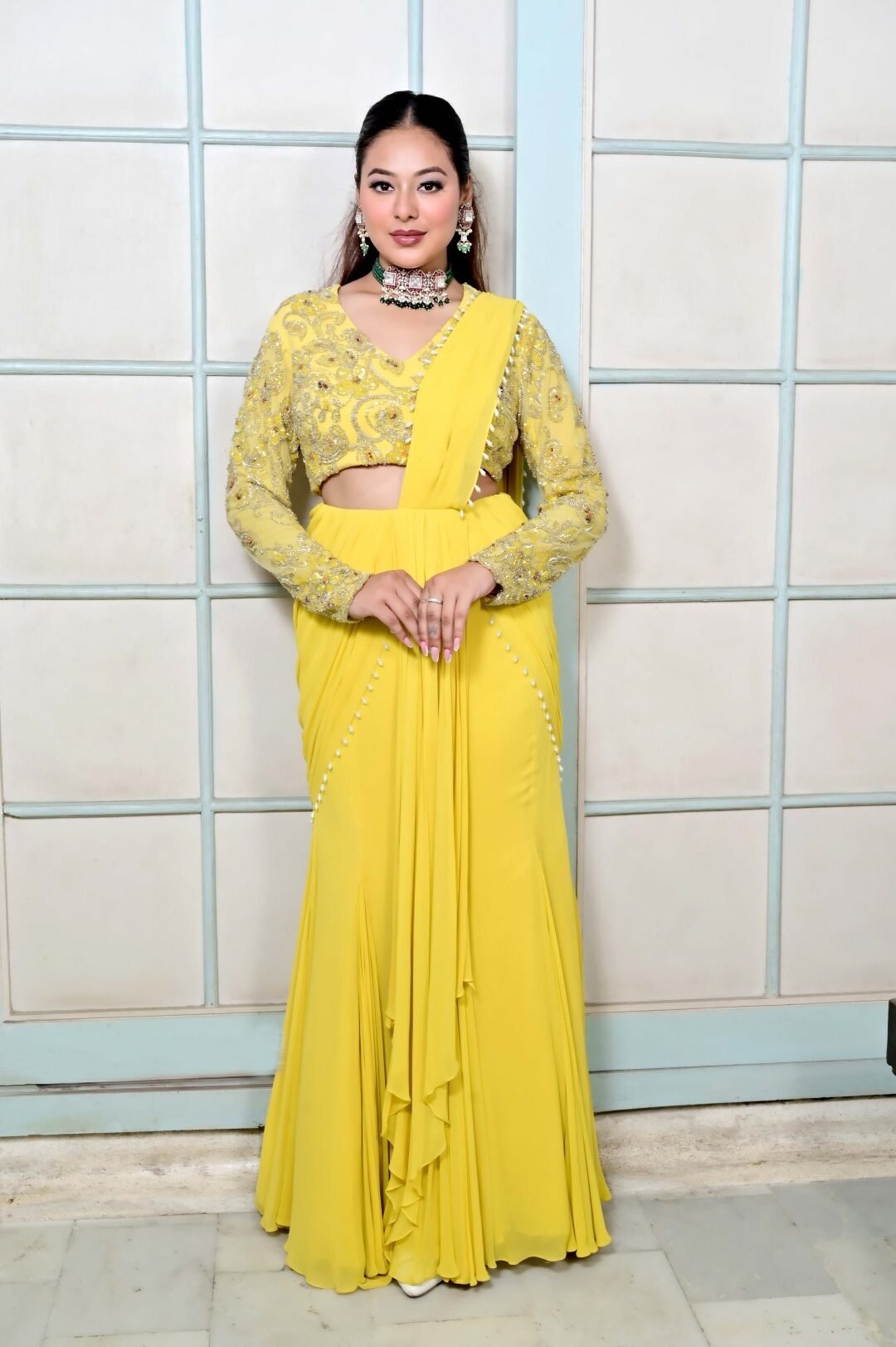 Designed for the modern woman who loves to blend tradition with contemporary flair, this gown captures the grace of a saree with the ease of a gown. The vibrant yellow hue, symbolic of happiness and celebration, makes it the perfect outfit for festive occasions.